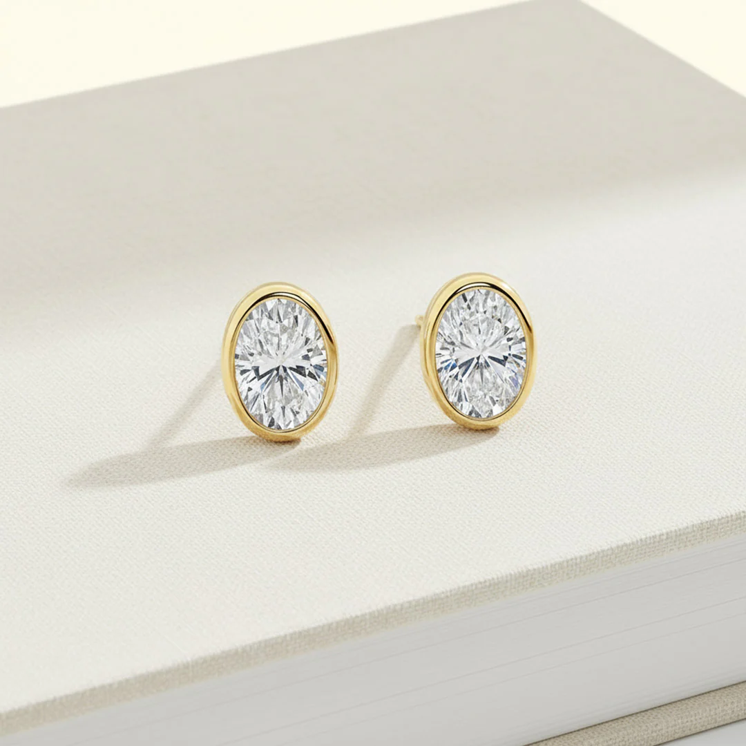 Classic sparkle meets modern design — 14K Yellow Gold Thin Bezel-Set Diamond Studs with brilliant oval diamonds, perfect for everyday elegance.