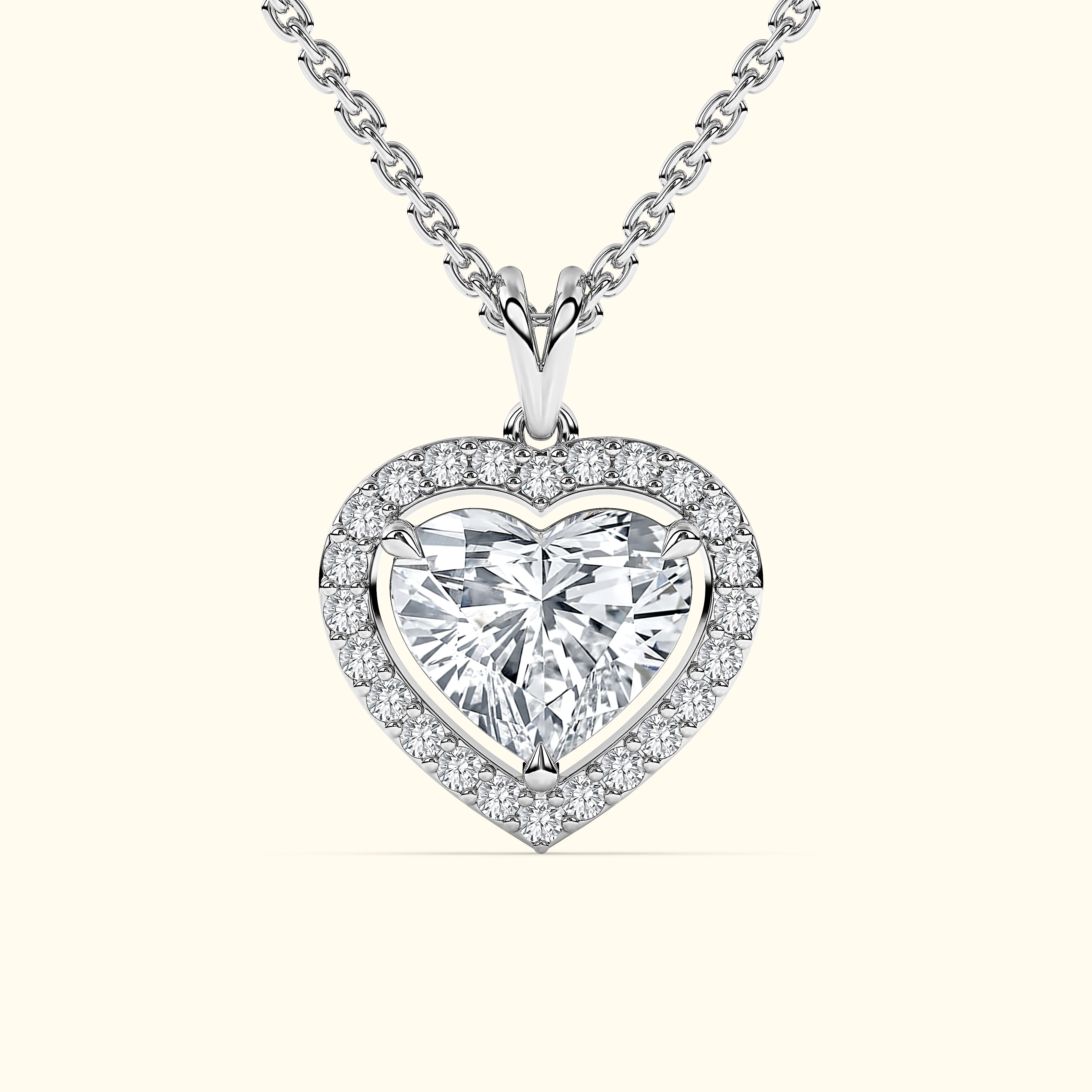 The Lab Grown Diamond Heart Pendant Necklace features a 3-carat heart-shaped center stone in 14K white gold, accented with sparkling stones for timeless elegance.