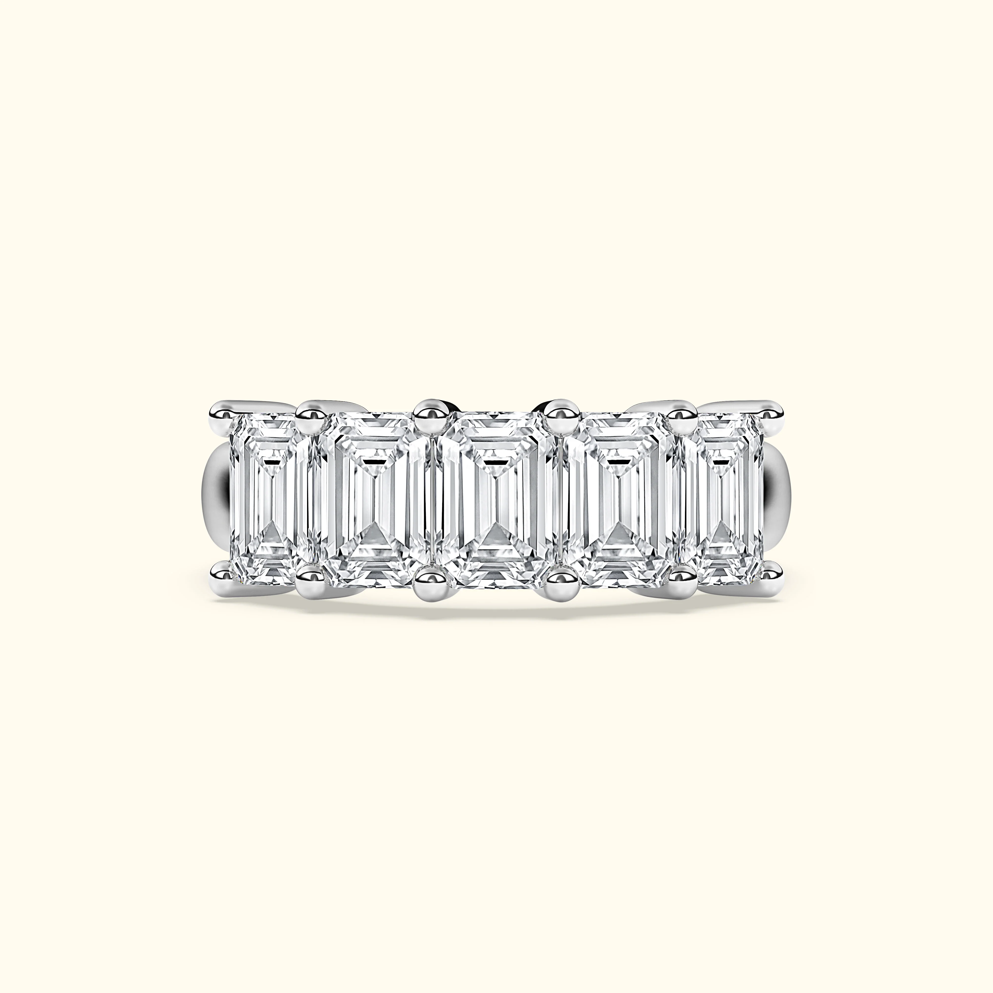 This ring features a five-stone shared prong design with emerald-cut diamonds, a seamless comfort-fit feel, and a refined total weight of 3.00 carats that elevates any look.