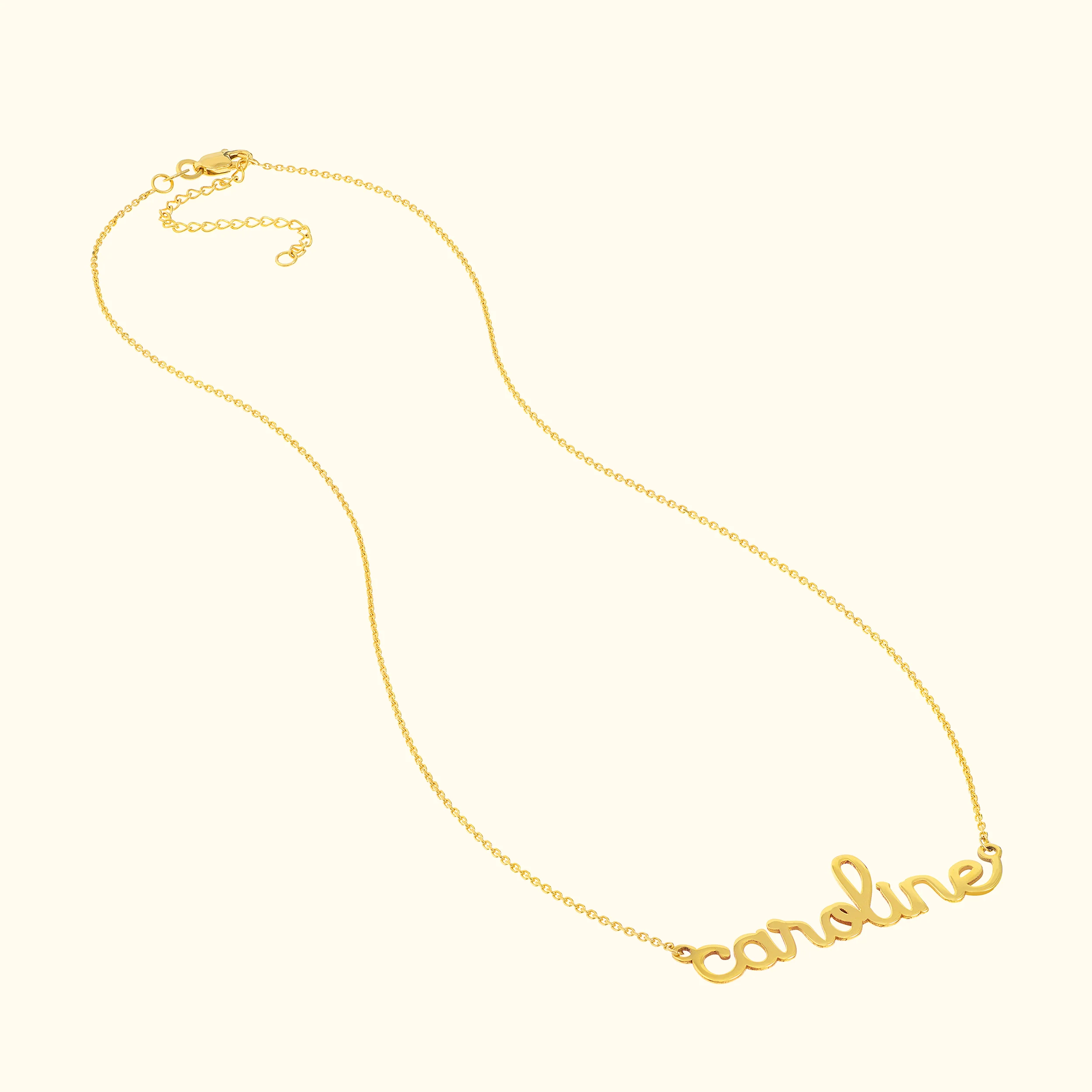 Feeling whimsical? Create a custom piece with this playful, doodle font nameplate necklace. Crafted in 14K yellow, white or rose gold.