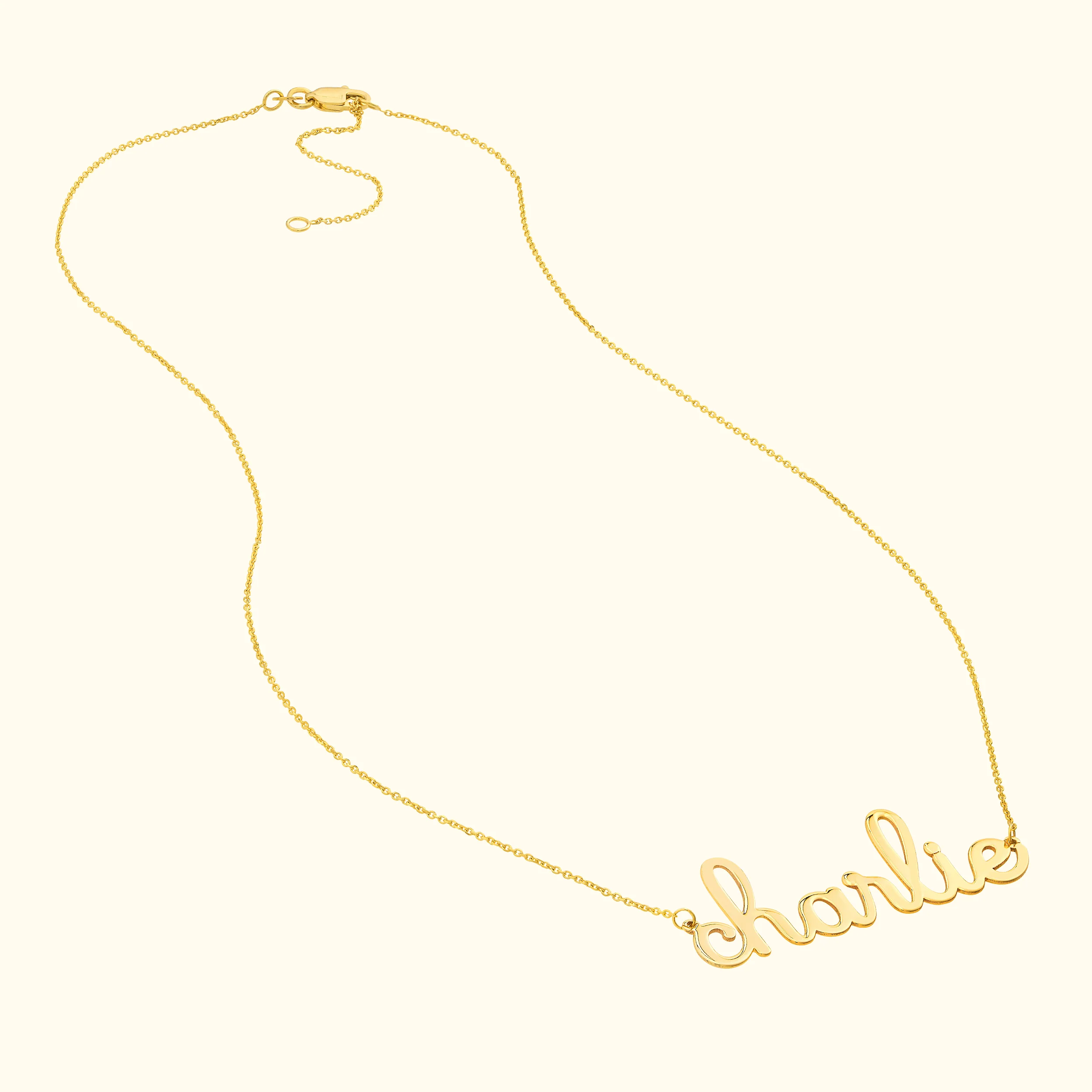 Feeling whimsical? Create a custom piece with this playful, doodle font nameplate necklace. Crafted in 14K yellow, white or rose gold