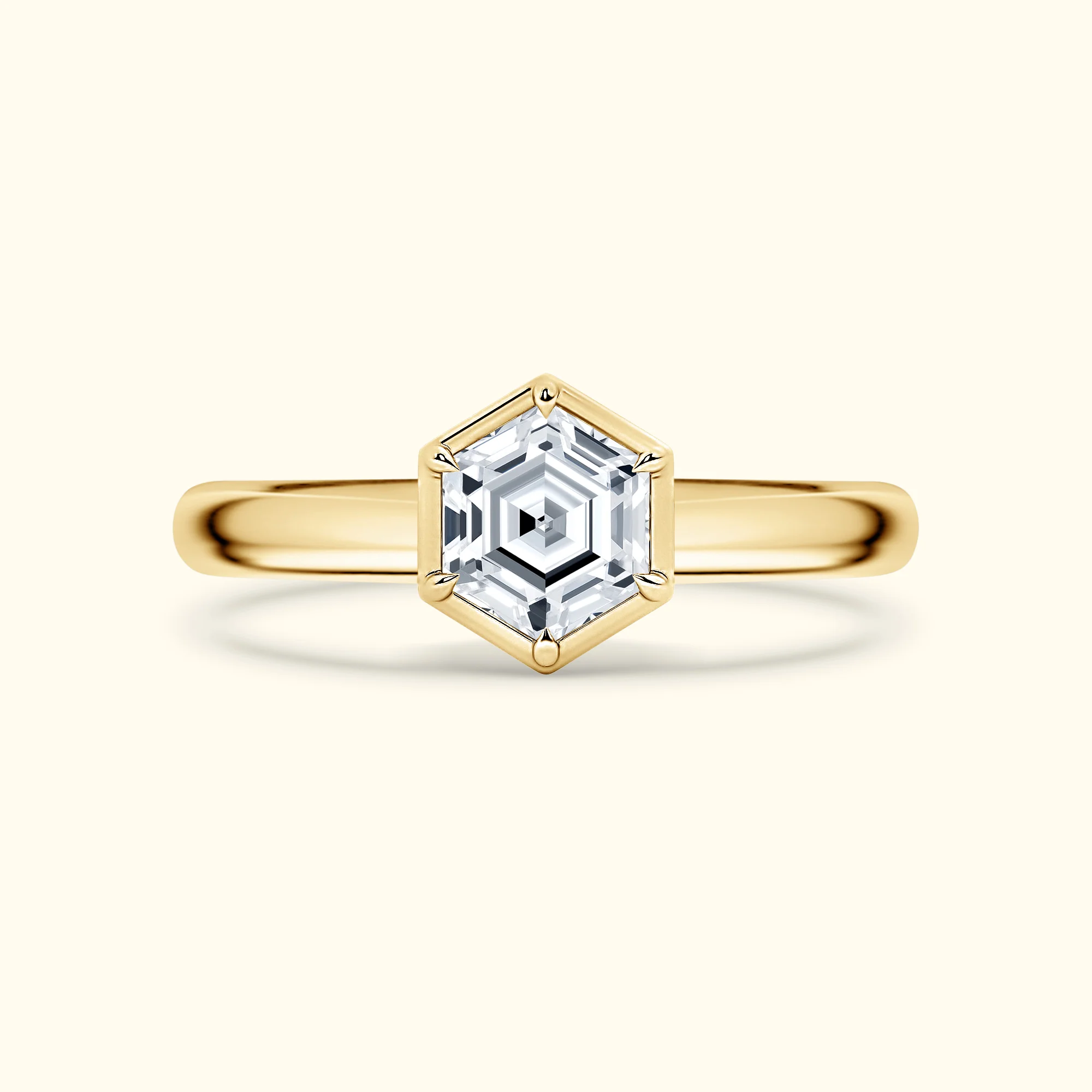 This hexagon-shaped diamond solitaire ring, available in 14K yellow, white, or rose gold, combines a unique cut with modern, timeless elegance.