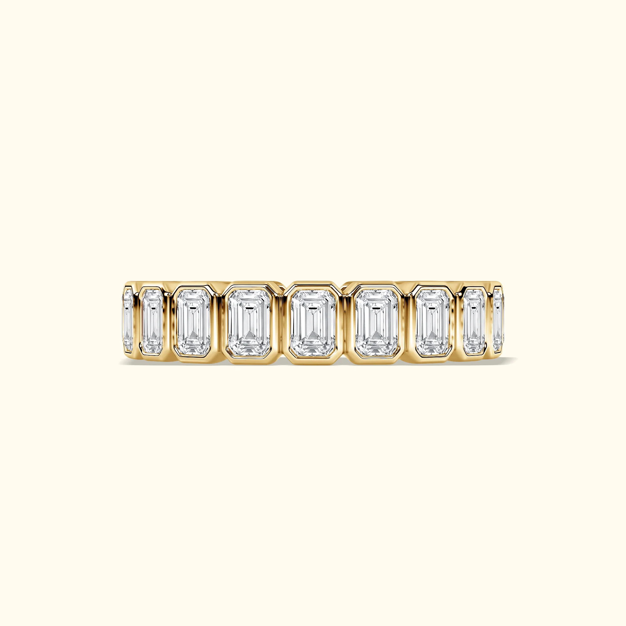 Sleek and sophisticated, this emerald-cut diamond eternity wedding band features a continuous row of bezel-set diamonds, offering modern elegance, clean lines, and enduring brilliance.