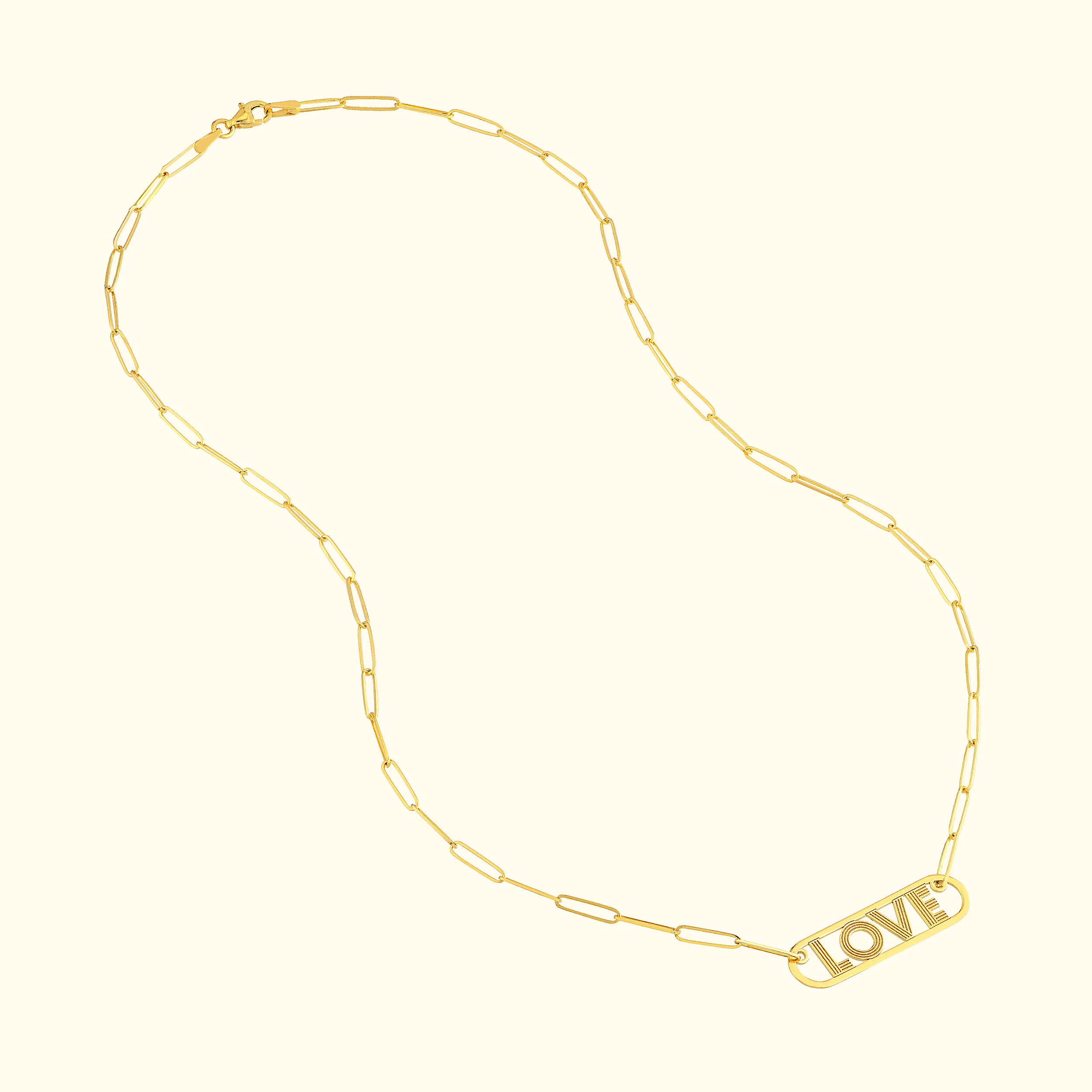 Time for romance. This necklace features a horizontal, block lined love plate on a handmade 2.6mm paper clip chain. Crafted in 14K gold.