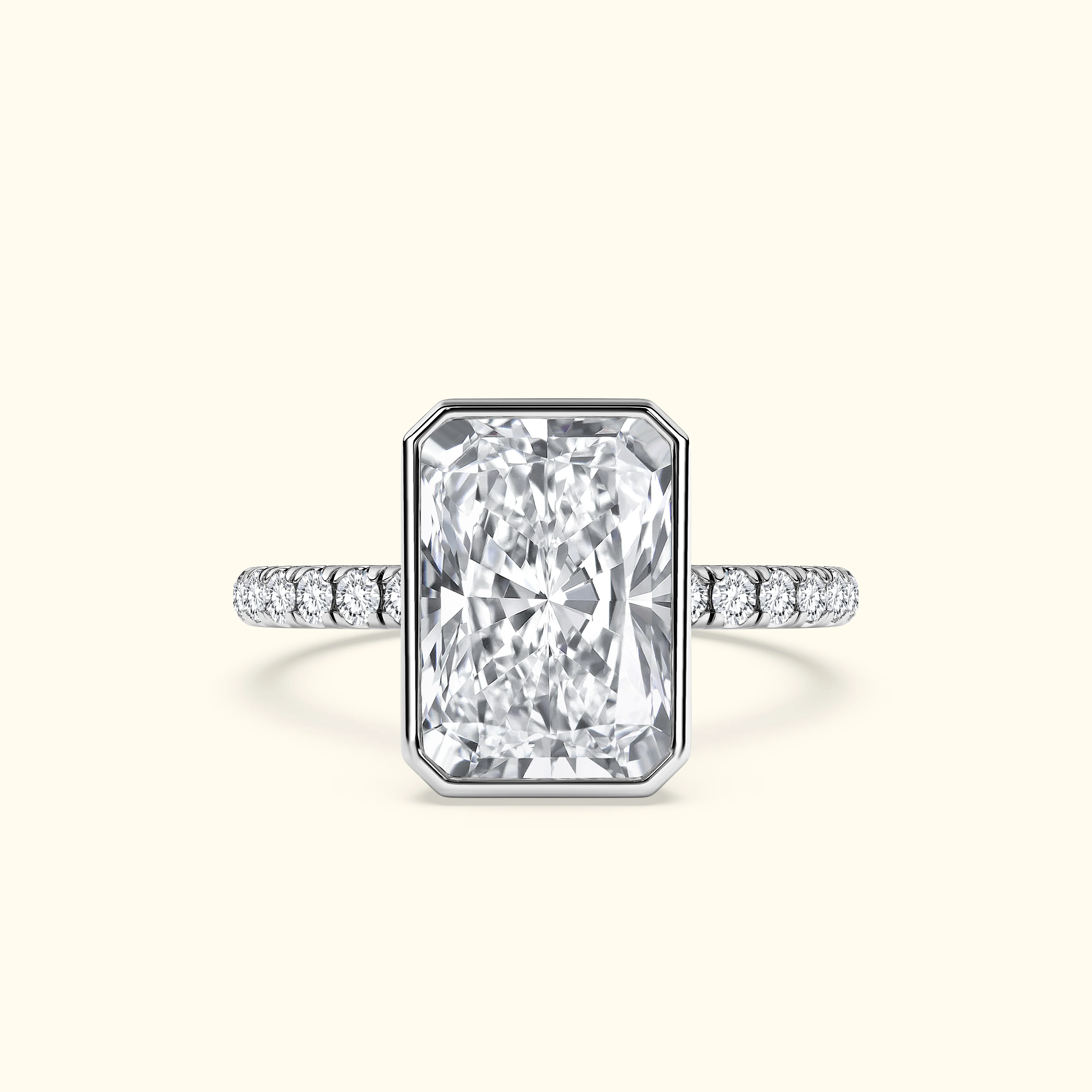 This elegant engagement ring showcases a bezel-set emerald or radiant-cut center diamond, paired with a sparkling French-set diamond band. A timeless yet modern design that shines with effortless sophistication.