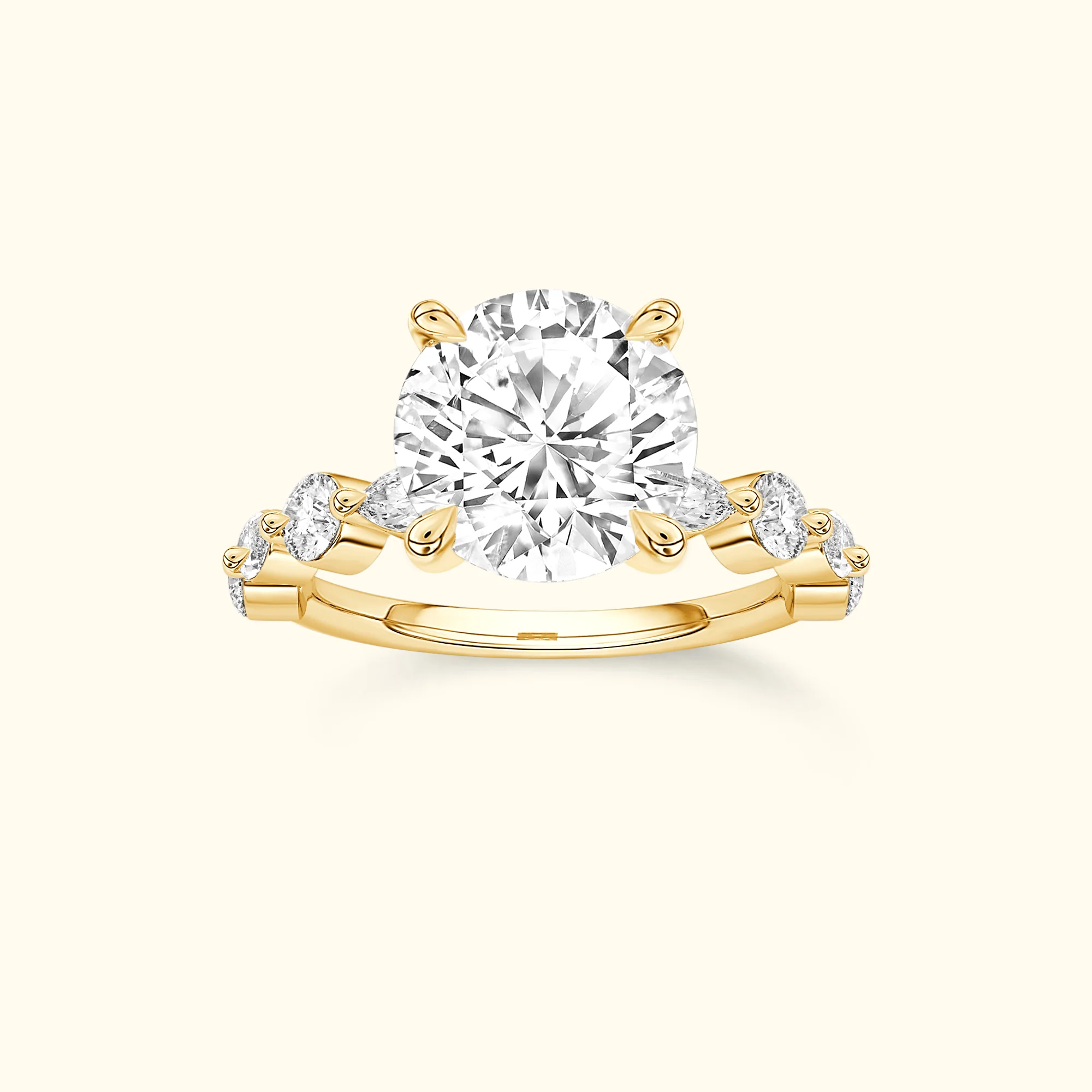 Showcase timeless elegance with this engagement ring—featuring a brilliant round center diamond, marquise and round side stones, and a tapered design that sparkles with vintage-inspired charm