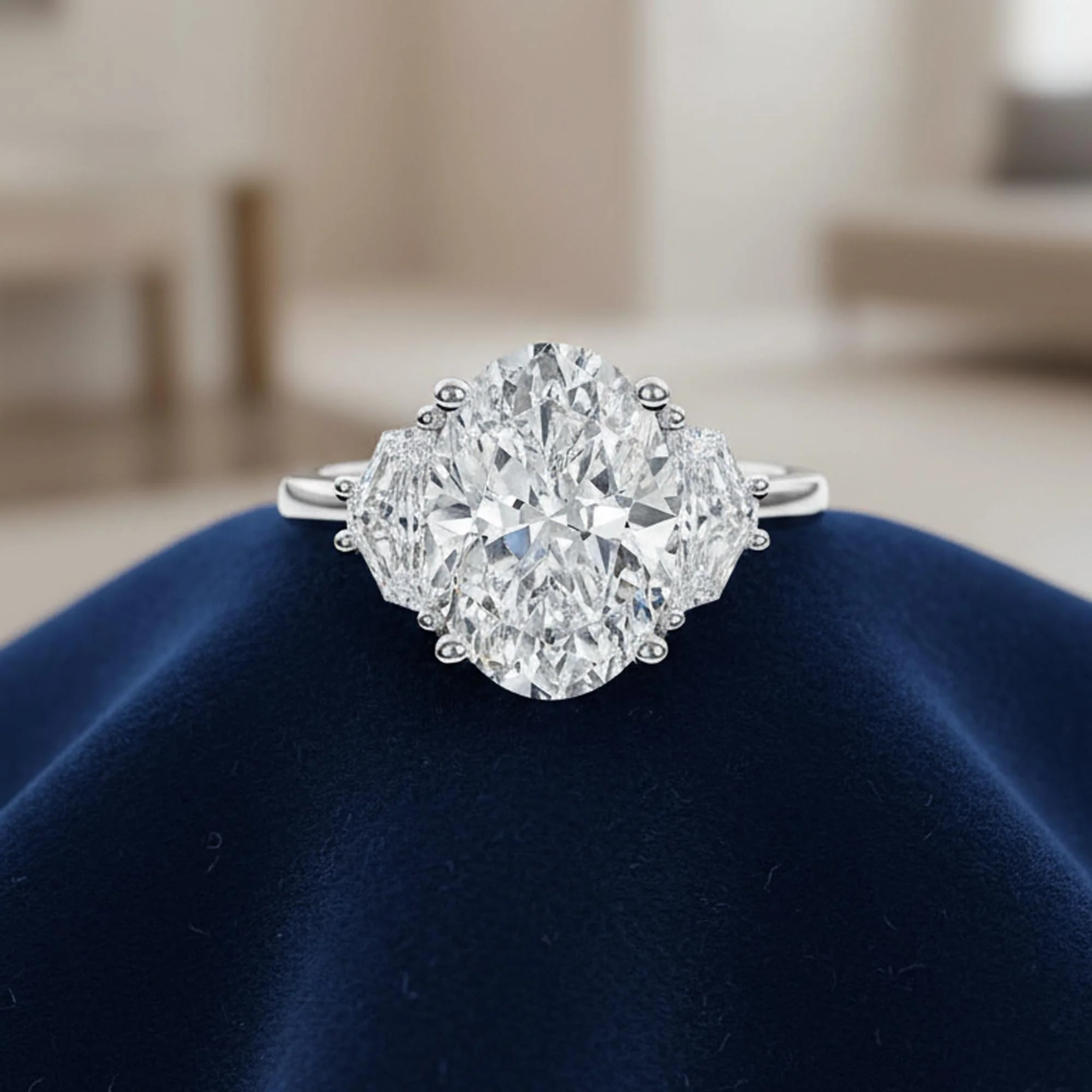 Dazzle her with this oval engagement ring—platinum or white gold, Cadillac side stones, and a sleek band combine vintage sparkle with modern elegance for an unforgettable proposal