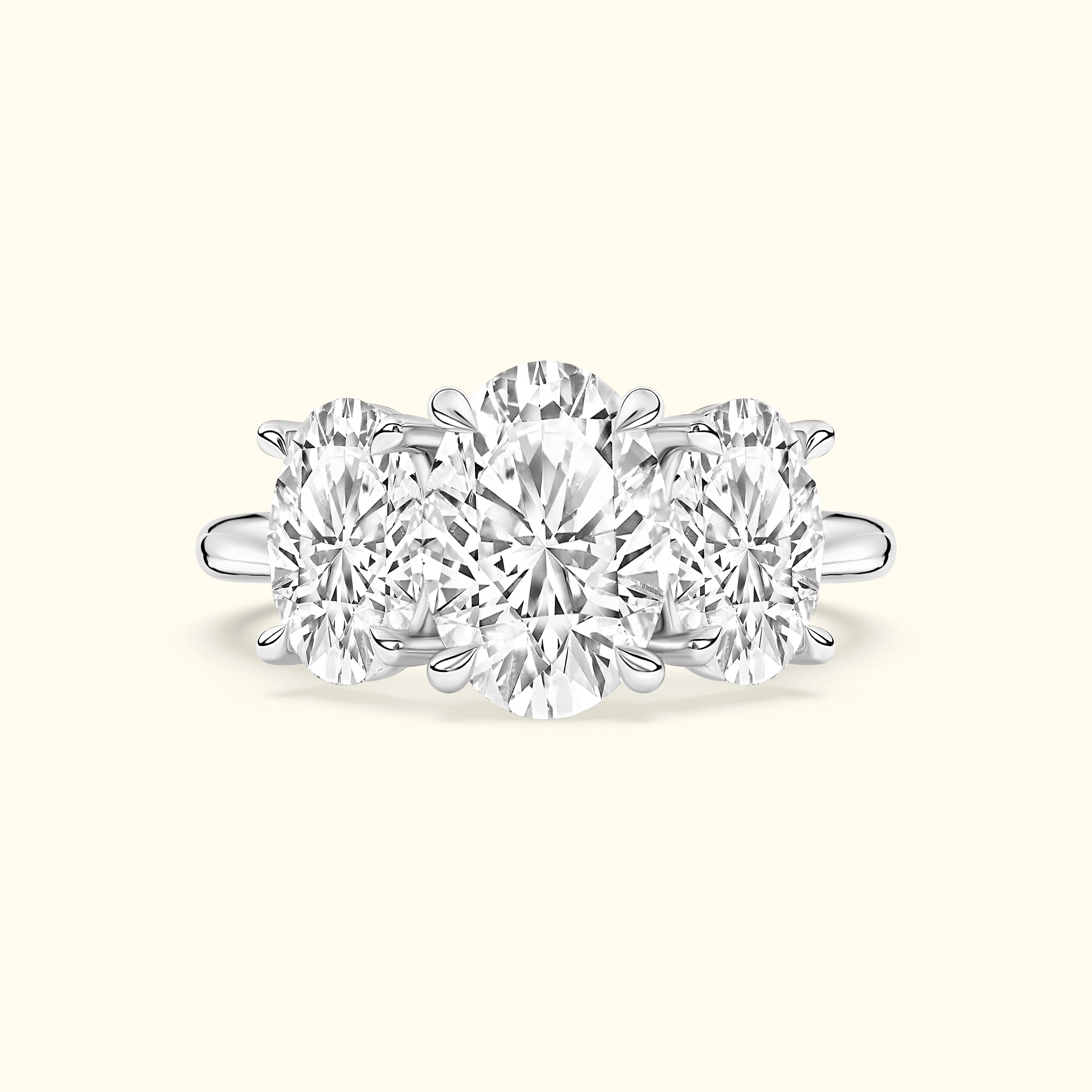 This elegant three-stone ring features a brilliant oval center diamond framed by two matching oval side stones. The classic setting highlights their sparkle and symbolizes your past, present, and future—a timeless design with modern grace.