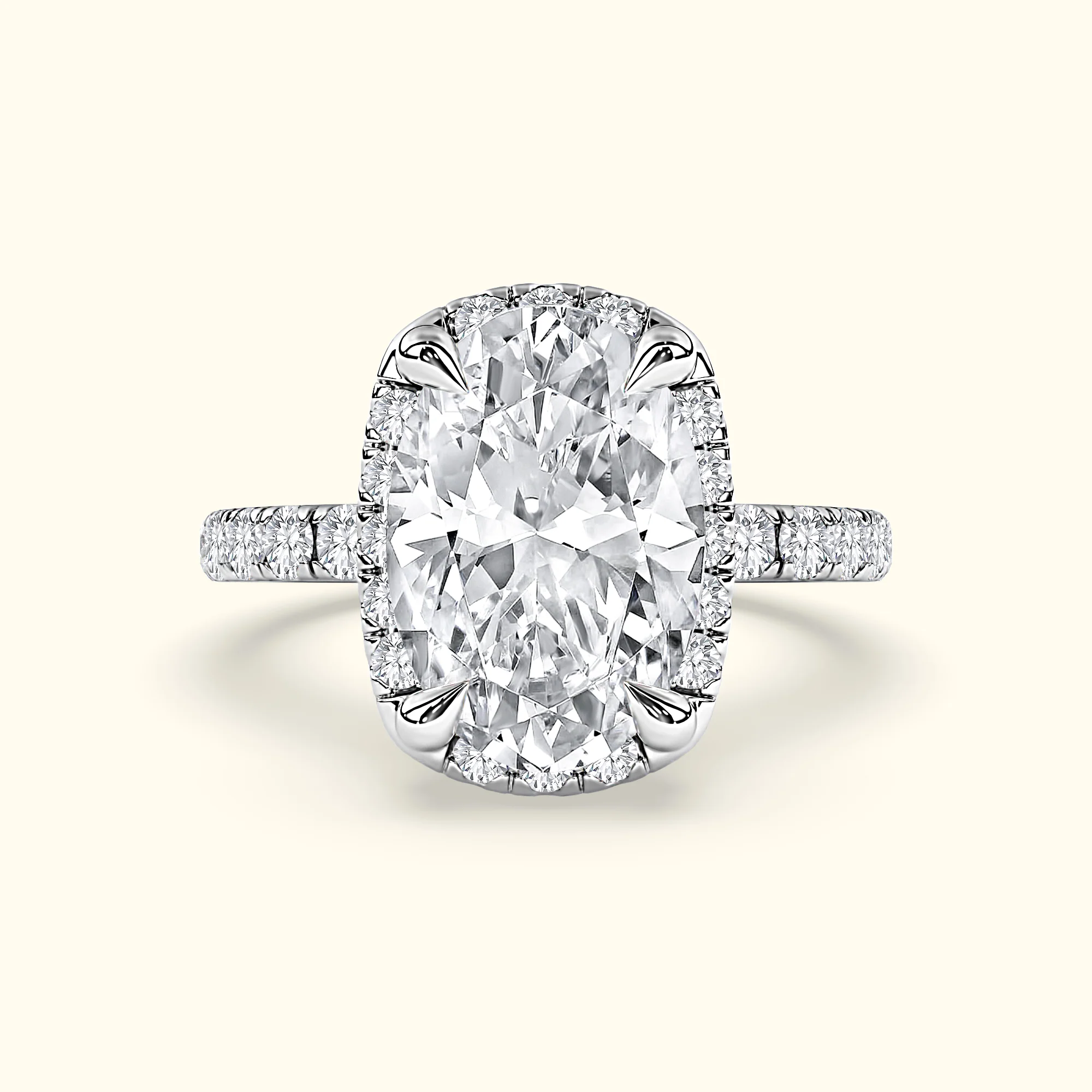 A dazzling oval center stone is surrounded by a radiant diamond halo, set in 14k white gold or platinum. Diamonds along the shank and prongs add extra brilliance, creating a timeless yet modern engagement ring made for unforgettable moments.