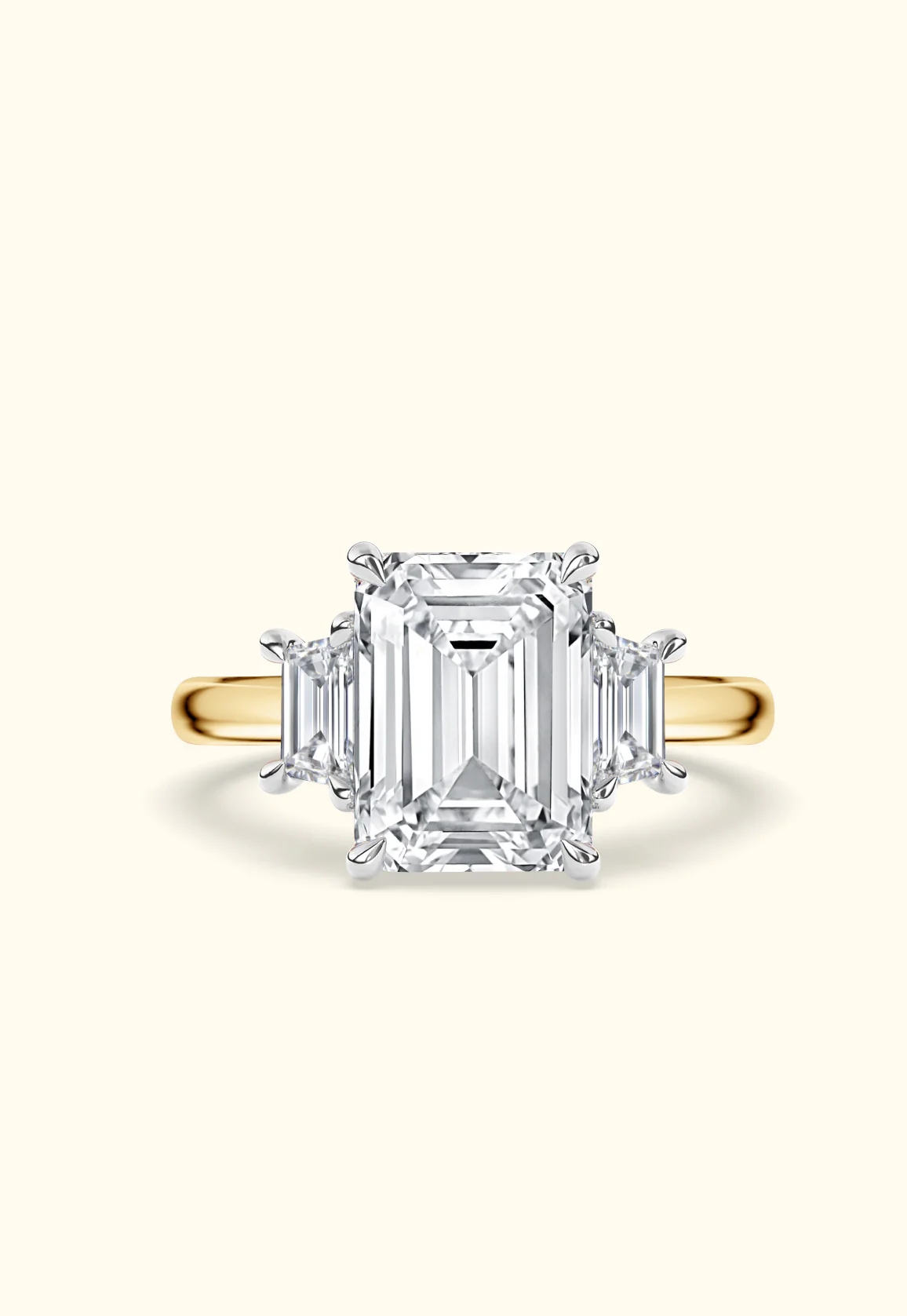 This ring features an emerald-cut center diamond with trapezoid side stones, creating a clean, modern look with timeless elegance.